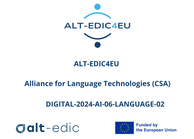 Проектът ALT-EDIC4EU ще даде възможност на ALT-EDIC да ускори развитието на стабилна и мащабируема инфраструктура и да обедини европейската екосистема за езикови технологии. Тя е разработена чрез обширни консултации с експерти, институции, публични органи и индустрии от стратегически области. В него участват 9 партньори за общо финансиране от ЕС в размер на 4 млн. евро от програмата „Цифрова Европа„чрез поканата за представяне на предложения „Цифрова Европа“-2024-AI-06. Тя започва през януари 2025 г. с продължителност 48 месеца.